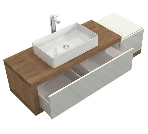 Wilgocioodporny mebel z szufladami w połysku, kontrastującym blatem i korpusem. Szafka wisząca, front wewnętrzny.