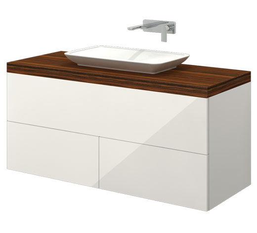 Wilgocioodporny mebel z trzema szufladami w połysku, oraz grubym blatem w kontrastowym dekorze. Szafka wisząca, front nakładany.