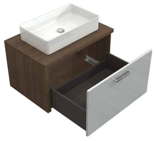 Wilgocioodporny mebel z szufladą w połysku i blatem w dekorze drewnopochodnym. Szafka wisząca, front nakładany.
