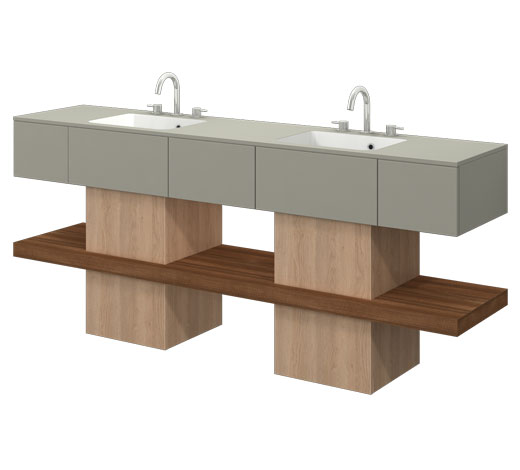 Wilgocioodporny mebel z dwiema umywalkami zintegrowanymi z blatem i szufladami. Szafka stojąca.