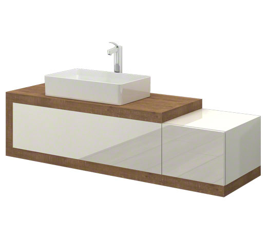 Wilgocioodporny mebel z szufladami w połysku, kontrastującym blatem i korpusem. Szafka wisząca, front wewnętrzny.