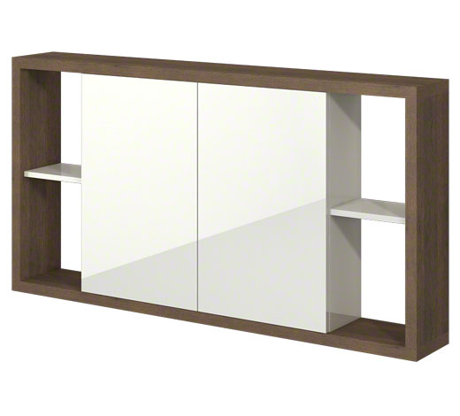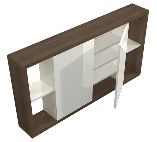 Wilgocioodporny mebel z drzwiami w połysku i otwartymi półkami. Szafka towarzysząca, wisząca, front wewnętrzny.