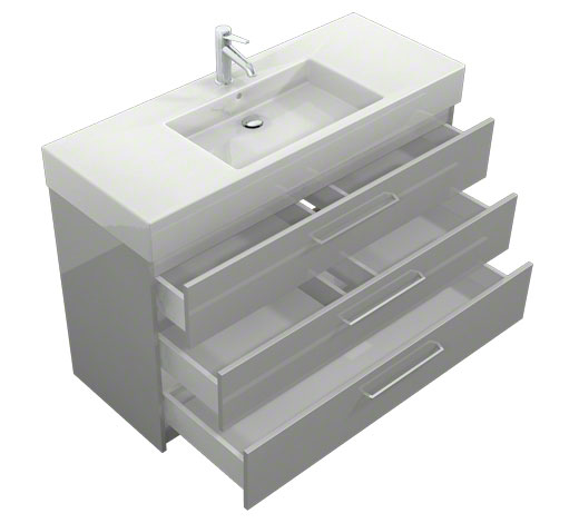 Wilgocioodporny mebel z trzema szufladami w szarym połysku. Szafka stojąca na cokole, front nakładany.