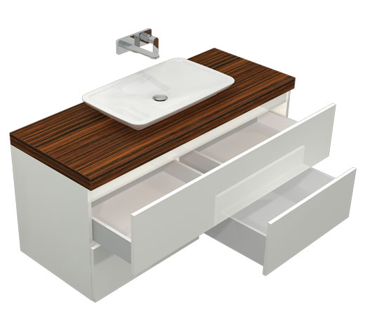 Wilgocioodporny mebel z trzema szufladami w połysku, oraz grubym blatem w kontrastowym dekorze. Szafka wisząca, front nakładany.