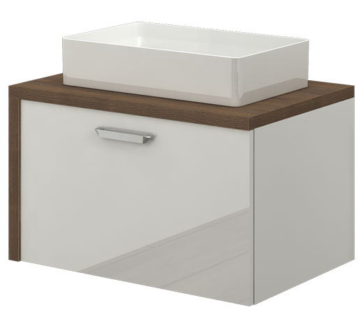 Wilgocioodporny mebel z szufladą w połysku i blatem w dekorze drewnopochodnym. Szafka wisząca, front nakładany.