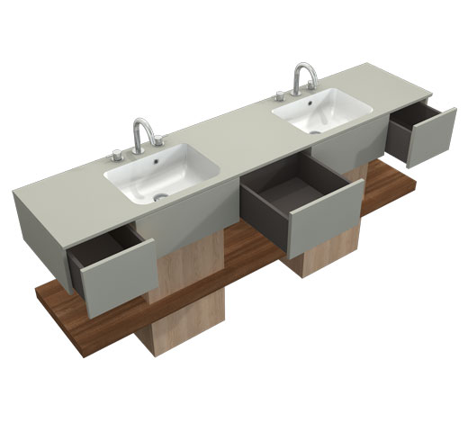 Wilgocioodporny mebel z dwiema umywalkami zintegrowanymi z blatem i szufladami. Szafka stojąca.